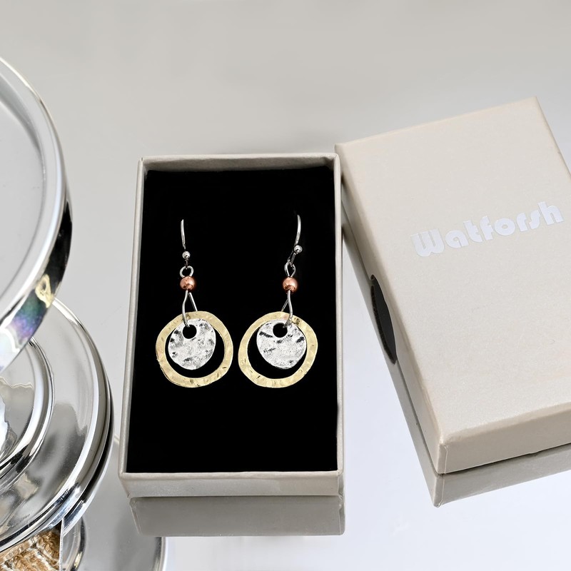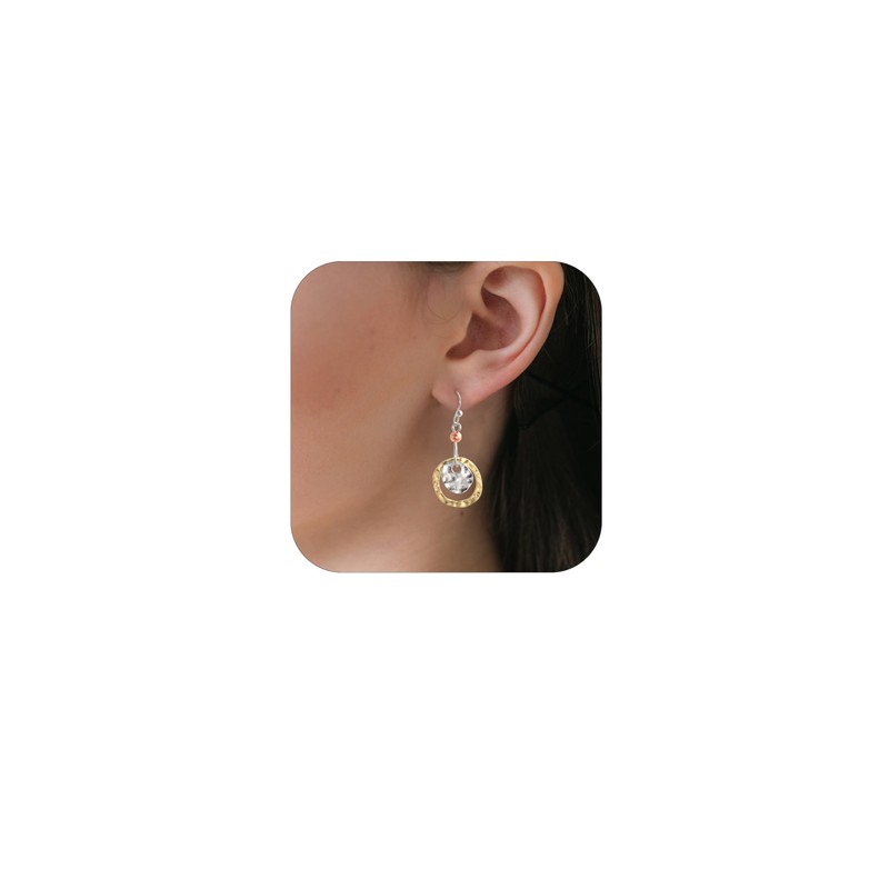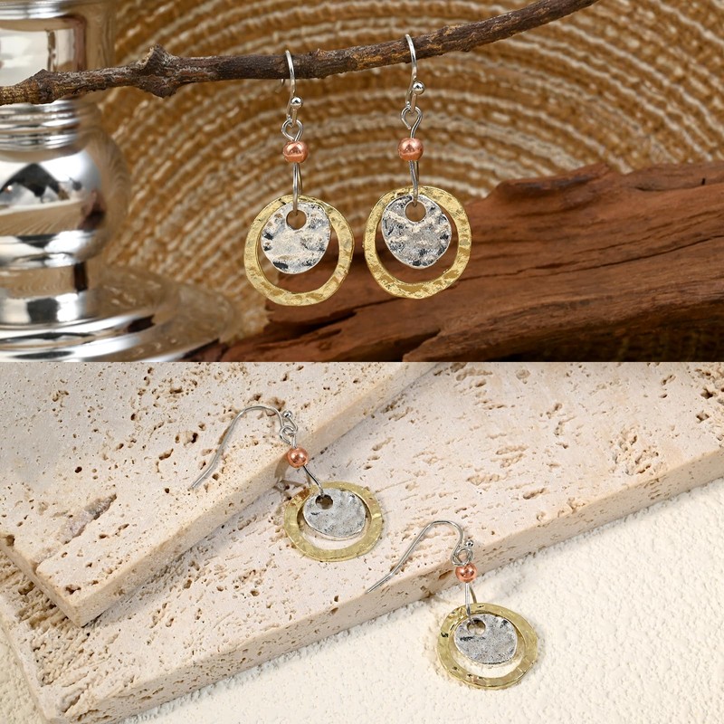 - Unique Design: These lightweight dangle earrings for women feature a captivating combination of gold, silver, and copper elements, creating a stunning two toned effect. The hammered gold outer circle and textured silver inner circle, along with the copper bead detail, make them a perfect example of mixed metal earrings, exuding a bohemian and vintage charm.