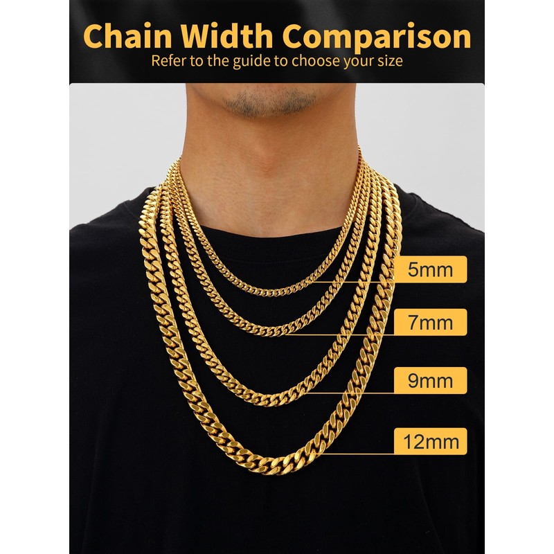 - Size of Big Gold Chain Necklace - 5mm/7mm/9mm/12mm width, 18/20/22/24/26/28/30 inches length. If you don't know your size, you can tie a string and measure it or refer to our model wearing display.