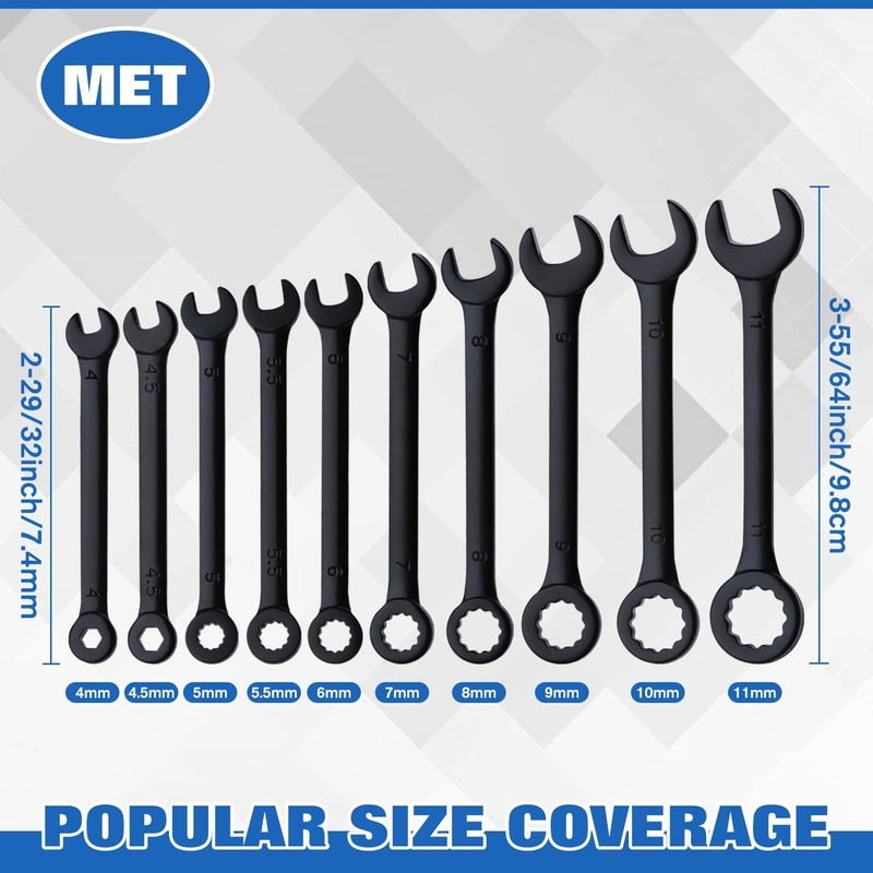 - Specifications: 10 pieces metric sizes: 4mm, 4.5mm, 5mm, 5.5mm, 6mm, 7mm, 8mm, 9mm, 10mm, 11mm; spanner sizes are printed on both sides of the handle for easy identification.