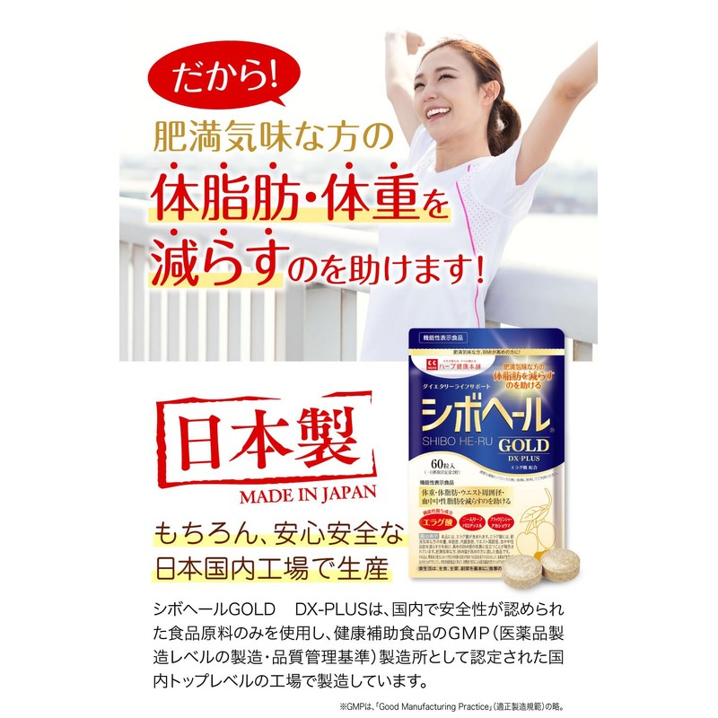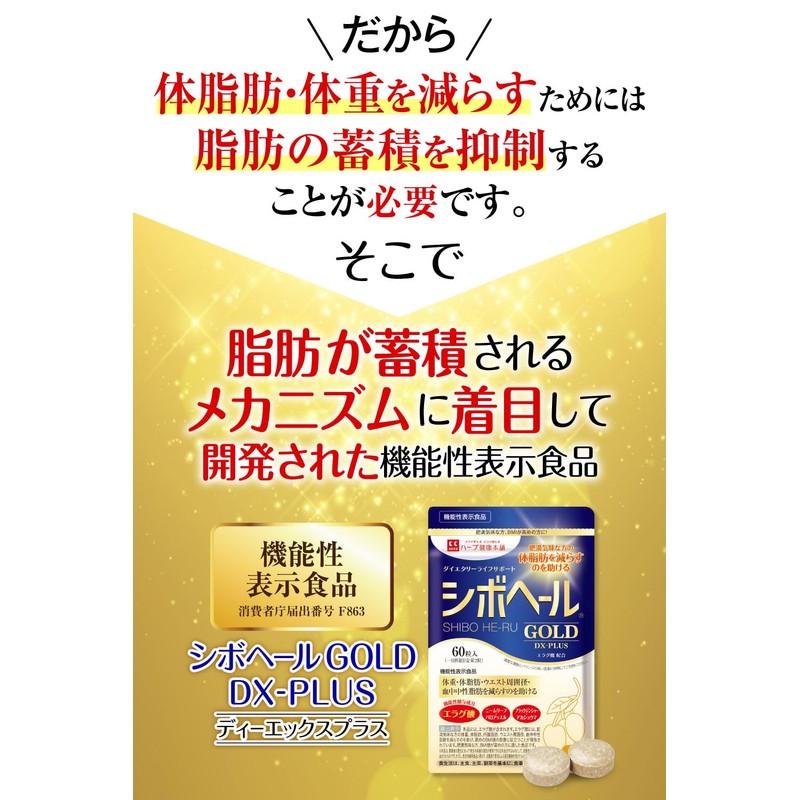 - 【 シボヘールGOLD DX-PLUS とは?】『 シボヘール GOLD DX-PLUS』は、 体重 ・ 体脂肪 ・ 内臓脂肪・ ウエスト ・ 中性脂肪 を減らすのを助ける「 エラグ酸 」を機能性関与成分とする シボヘール シリーズ最高峰(※)の 機能性表示食品 です。 エラグ酸 は、 肥満気味 な方の 体重 、 体脂肪 、 内臓脂肪 、 ウエスト周囲径 、 血中中性脂肪 を減らすのを助け、高めの BMI 値の改善に役立つことが報告されています。 肥満 気味な方、BMI値が高めの方に適した食品です。(※ シボヘール シリーズ 機能性表示食品 内で届出表示の機能性項目( 体重 、 体脂肪 、 内臓脂肪 、 ウエスト周囲径 、 血中中性脂肪 、 BMI値 )が最も多い。)