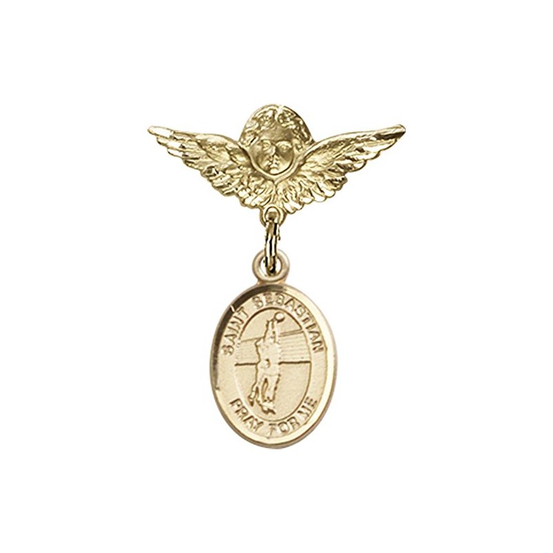 Gold Filled Baby Badge with St. Sebastian/Volleyball Charm and Angel w/Wings Badge Pin 1 X 3/4 inches