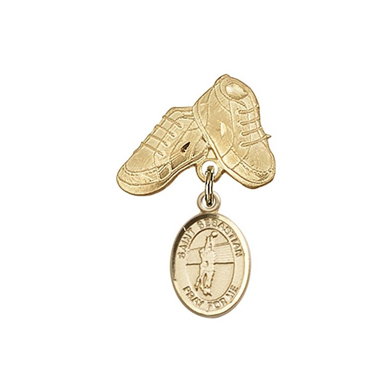 14kt Yellow Gold Filled Baby Badge with St. Sebastian / Volleyball Charm and Baby Boots Pin