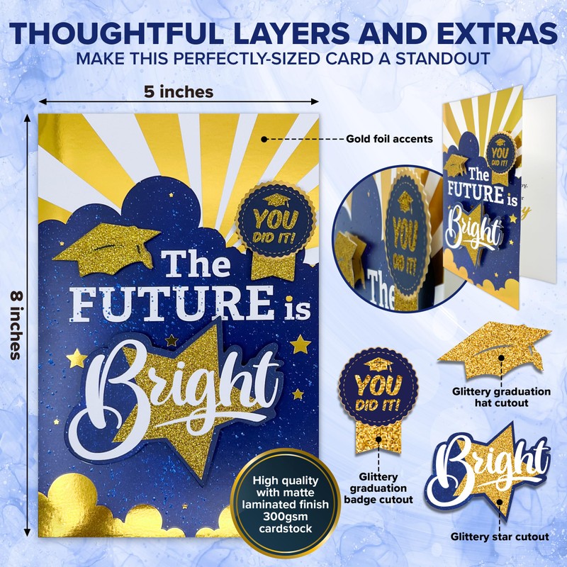 - ELEGANCE IN EVERY DETAIL - Honor the graduates' achievements with this graduation greeting card! Featuring gold foil and glittery accents, these happy graduation card for him showcase golden stars and midnight blue tones symbolizing pride & success.