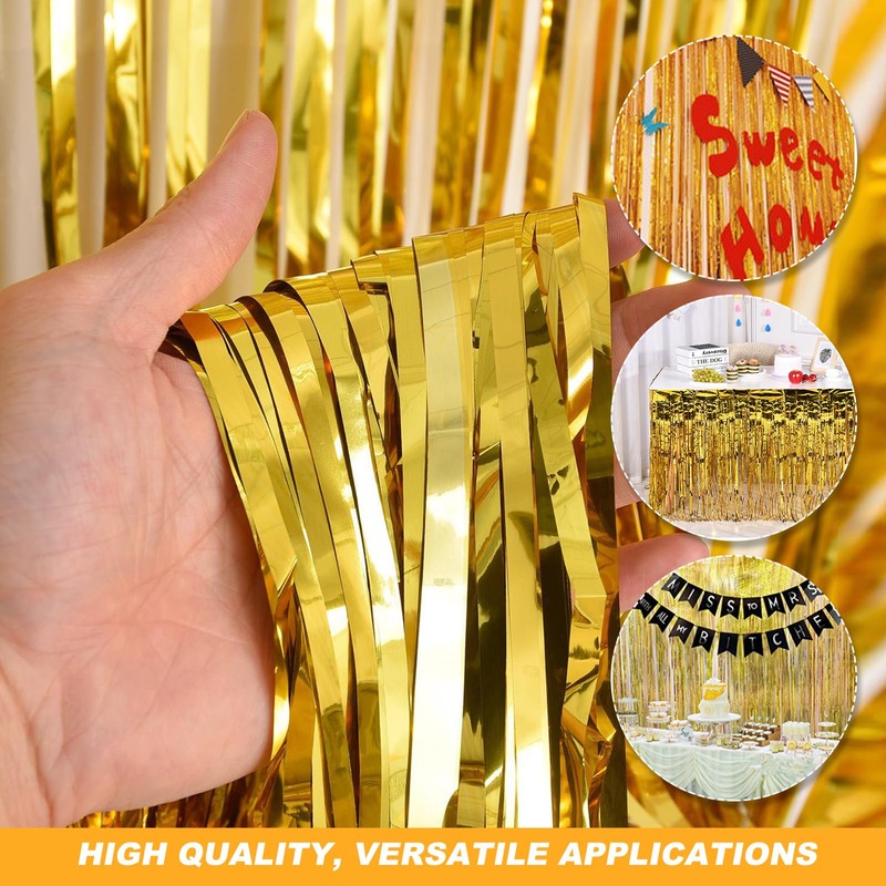 - Gold Backdrop Size: Each gold tinsel foil fringe curtains measures 3.3 ft x 6.6 ft / 1 m x 2 m, with a length sufficient to decorate your party. You can also cut them into appropriate sizes and lengths as needed.