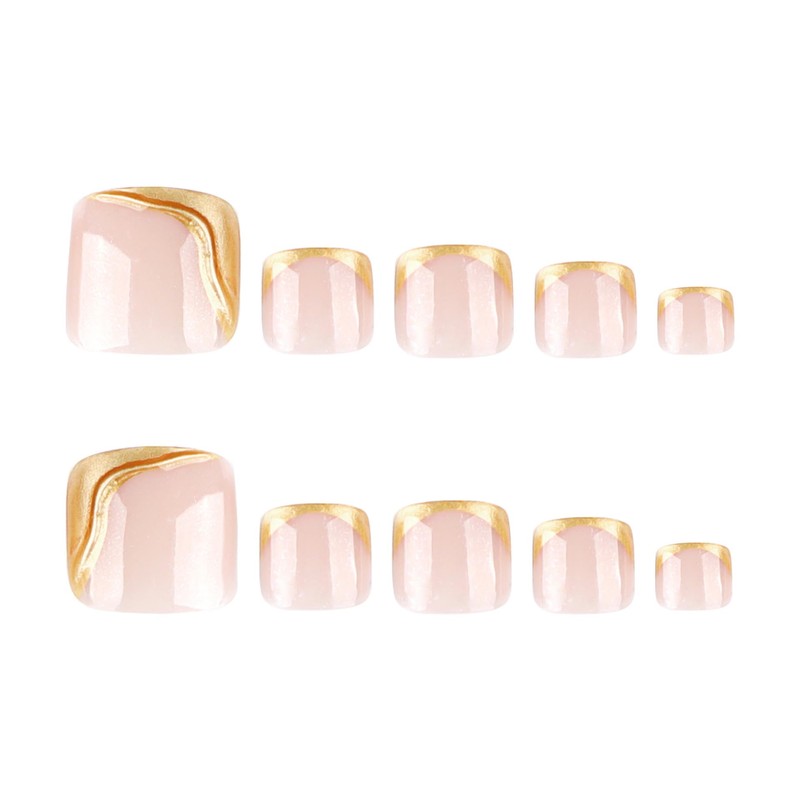 Gold French Tip Press on Toenails Short Square Fake Toenails - Nude Pink Nails Press Ons with Gold Stripe Design Glossy Fake Toes Nails Press on Summer Artificial Glue On Toenails for Women Girls