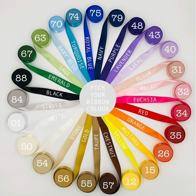 - Each box comes with 2 meters of double-sided luxury satin ribbon (25mm width), choose from 24 colours to match your style.