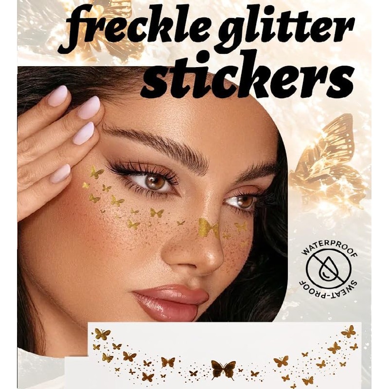 - Gold Glitter Freckles: the cutest little glittery star freckles add a fun subtle glow to their outfits without looking cheesy. The glitter touch elevates our looks and adds fun to our make-up. Ours look good without makeup on or over makeup.