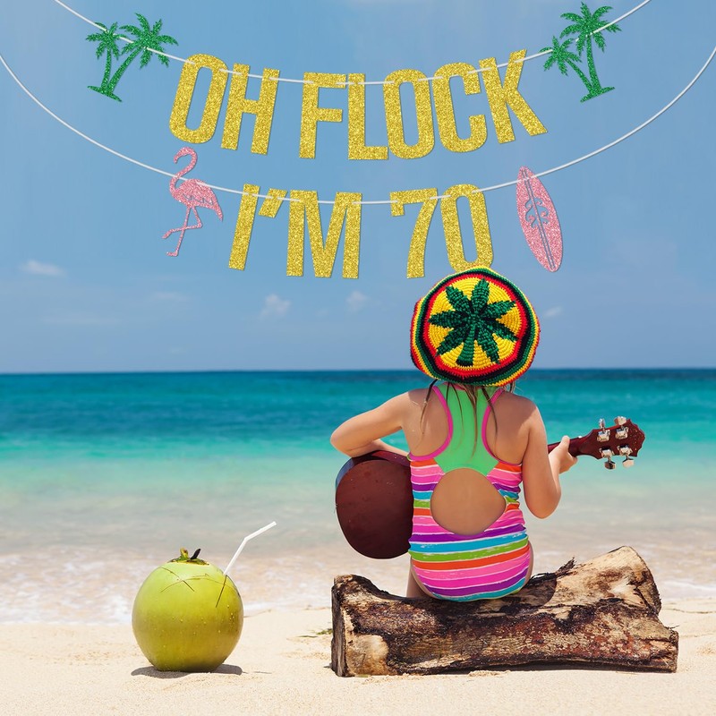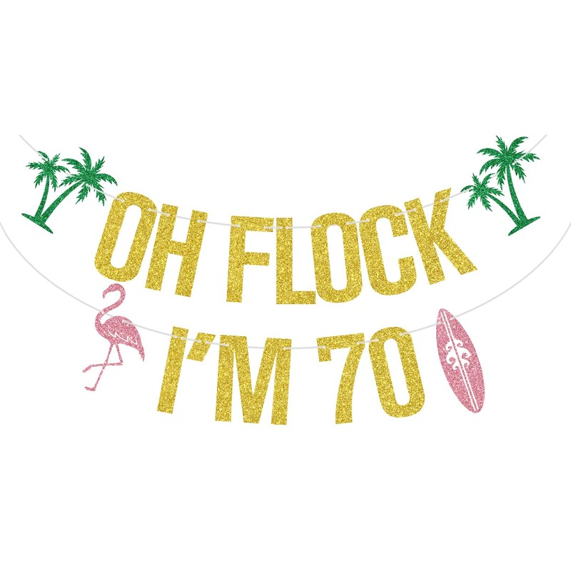 Gold Glitter Oh Flock I'm 70 Banner, Aloha 70/Flamingo Happy 70th Birthday, Hawaiian Tropical Luau Summer Beach Vacation Birthday Party Decorations