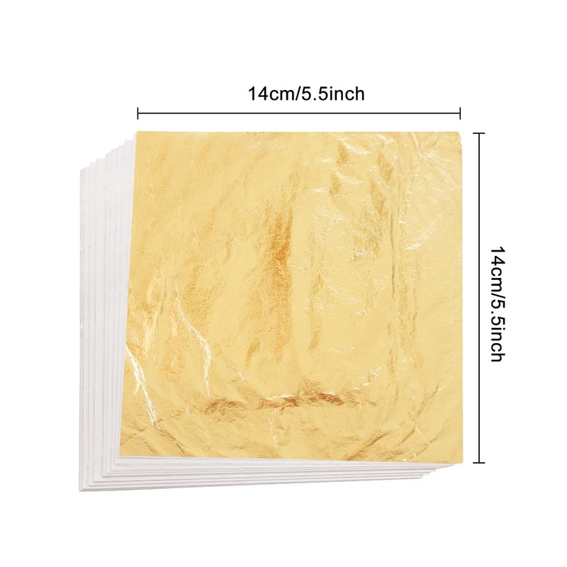 - √100 pieces 14cm x 14cm gold foil, made from 86% copper and 14% zinc, These imitation gold foils are loose leafed, with each sheet sandwiched between tissue-like paper sheets. To use, gently lift a tissue paper and grasp the sheet underneath it. The imitation gold material, whose main component is copper, is perfect for restoring furniture into beautiful new-looking gold treasures at home. It can also be used to make your crafts more resplendent.non-edible,can't be used for cake baking