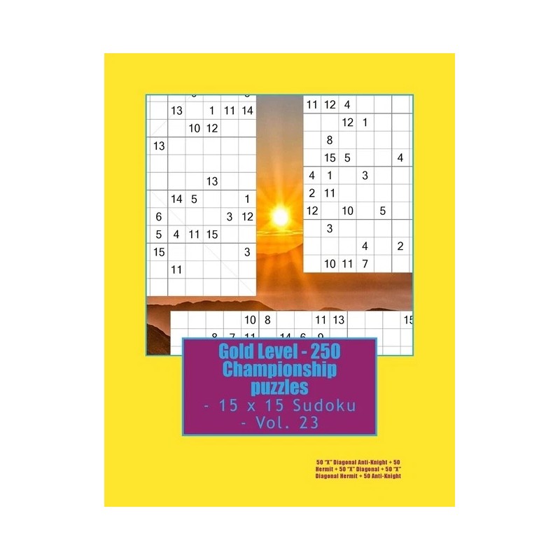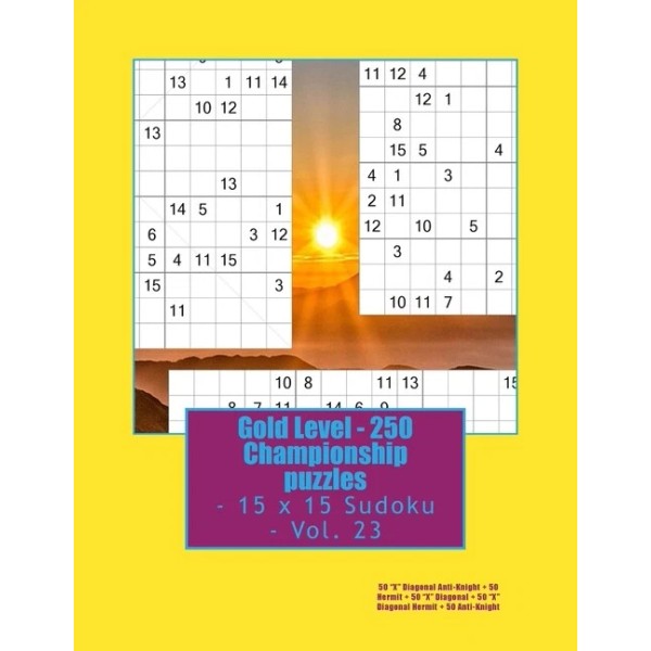 - Book Title: Gold Level - 250 Championship Puzzles - 15 X 15 Sudoku - Vol. 23 : 50 X Diagonal Anti-Knight + 50 Hermit + 50 X Diagonal + 50 X Diagonal Hermit + 50 Anti-Knight. This Is the Perfect Book for You
