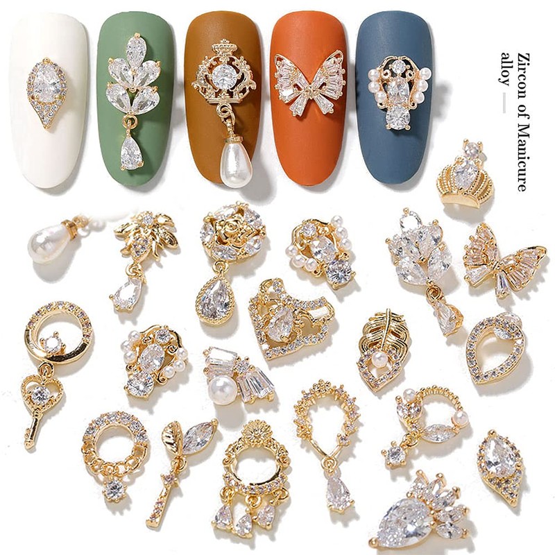 HNUIX Nail Charms and Gems - Gold Copper Zircon, Multiple Shapes 3D Dangle, Metal Jewelry Rhinestones for Nails 24 Pieces