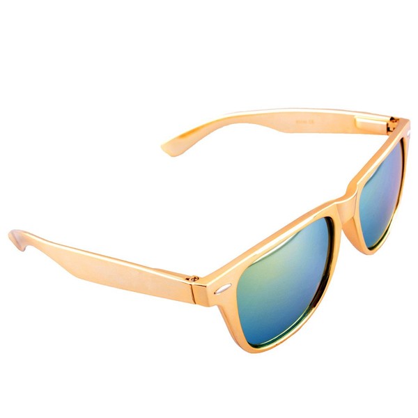 Gold Metallic Wayfarer Sunglasses. Design features a golden metallic frame with green iridium lenses. One size fits all.