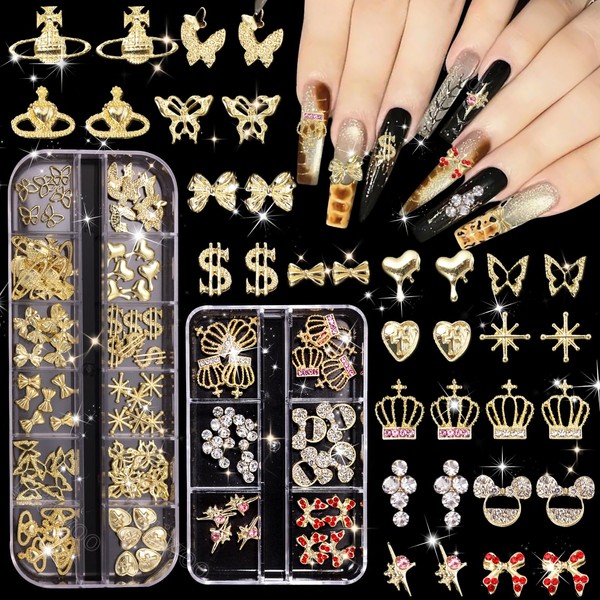 - A Riot of Styles: These are 96 pieces alloy gold nail charms, including crown nail charms, bows nail charms, heart nail charms, planet nail charms, dollars nail charms and butterfly nail charms. You can have a lots design nails art and make them shine and eye-catching