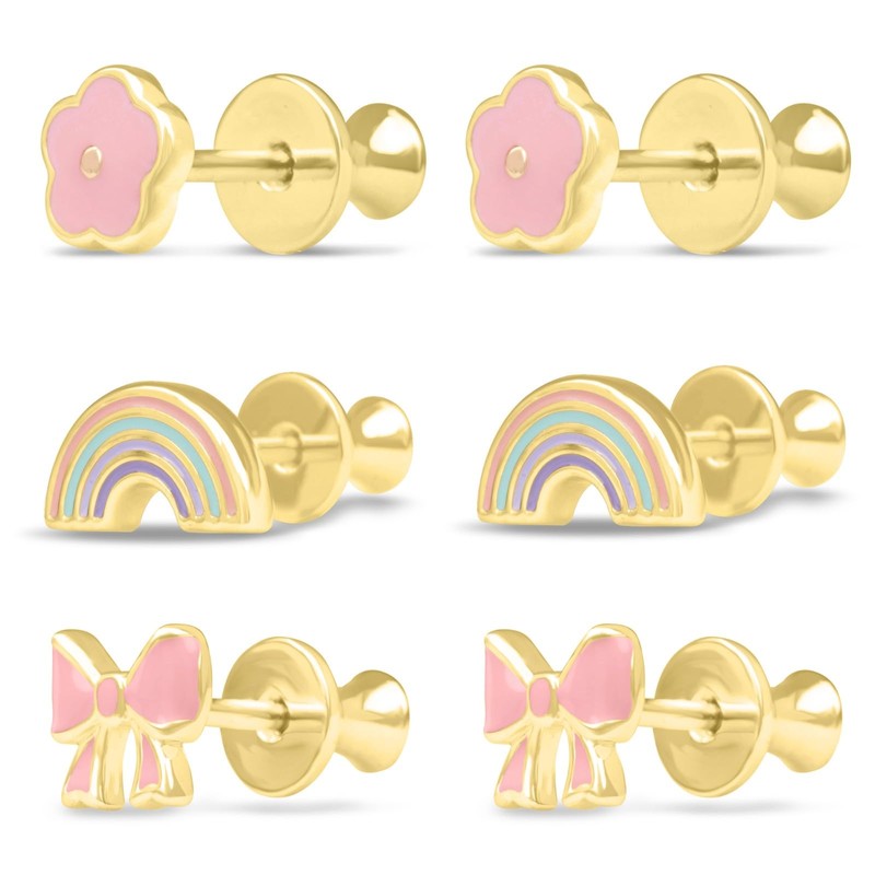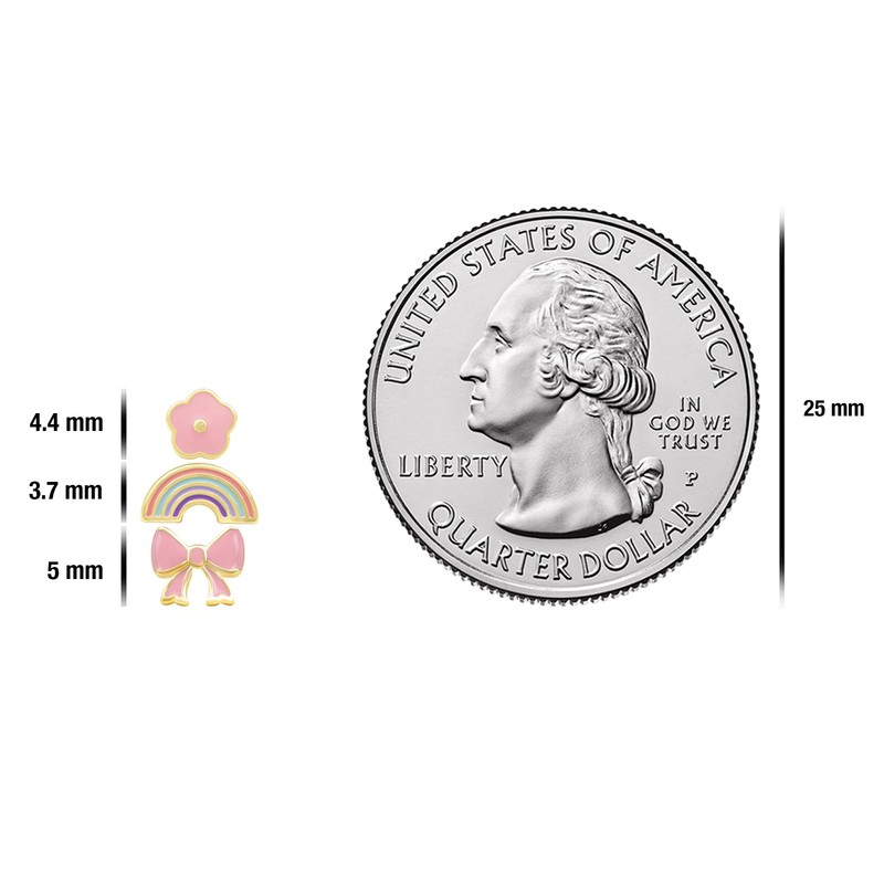 - 3-Pair Set: Includes three fun and colorful pairs of earrings with bow ribbon, rainbow, and flower enamel designs for versatile styling.