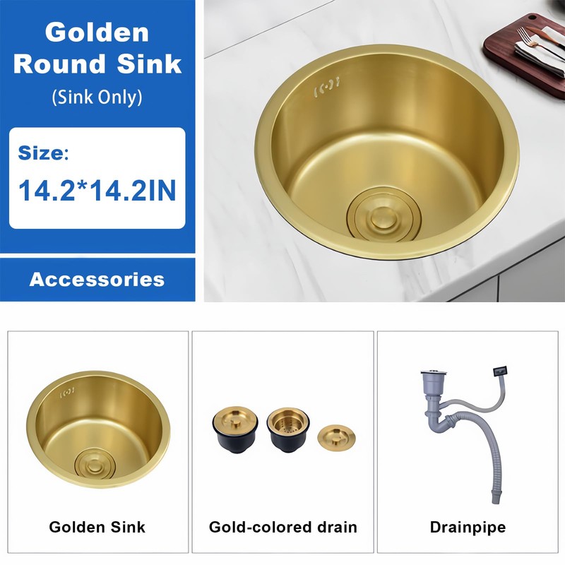 Gold Round RV Sink 14 Inch Undermount Kitchen Single Bowl Sink, SUS304 Stainless Steel Bar Counter Small Sink With Accessories (Gold, 14.2x14.2in)