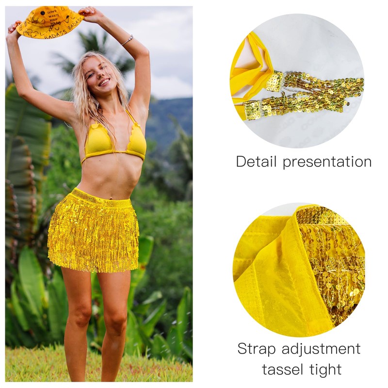 - [Perfect for Most Occasions]:Gold wrap tassel skirt is a great choice for belly dancing, Halloween, birthdays, disco parties, music festivals, clubs, raves, Zumba, yoga classes, holiday party performances, classic fringe dresses, perfect for summer beach, pool parties and more.