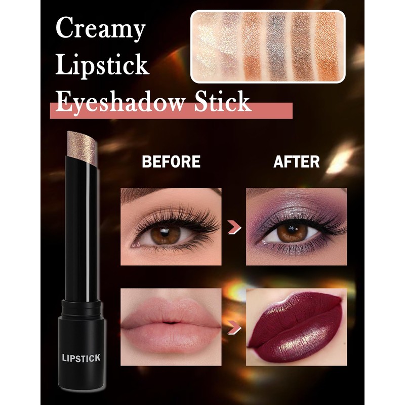 - Glitter Lipstick Eyeshadow Stick - 6 shades of lipstick eyeshadow sticks with a silky smooth texture, highly pigmented that delivers a high-gloss, lightweight, shimmering finish in just a few swipes, making it easy to create a strikingly beautiful look that will make you the center of attention, day or night