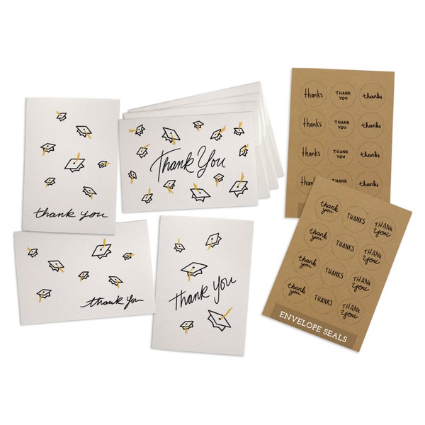 - MINIMAL & MODERN - Graduation Thank You Cards feature Gold Tasseled Grad Caps in the Air in four (4) fun designs for variety when sending your graduation party thank you cards out in 2022. Includes Kraft Envelope Seal Stickers