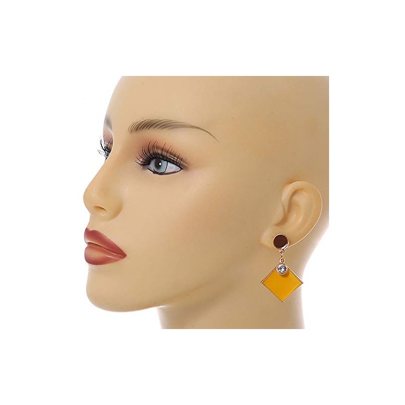 Gold Tone Enamel Square Drop Earrings/Brown/Yellow/40mm Long