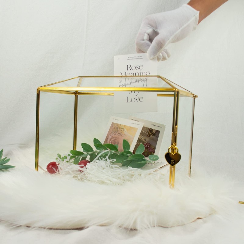 - Gold wedding glass card box with a slot on the top and a side lockable door, a heart-shape lock with key is included to ensures that the contents inside are safe and secure,perfect to use on the centerpiece for wedding or party, as a gift for room decor.