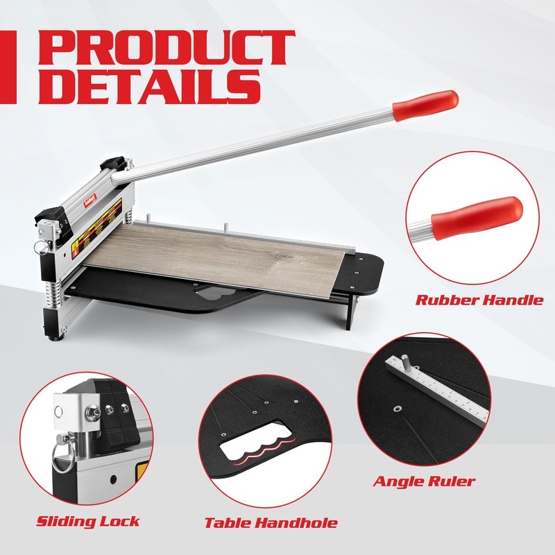 • Sturdy Construction: Made of durable aluminum alloy, plus ABS support table and handle, PVC foot pads; Integrated Straight Cutting Fence with Imperial/Metric Ruler and Angle Indications at 0°, 22,5°, 30° & 45°; High-speed steel blade with extra hardness cuts floor quicker, neater and easier, each blade will cut many times on regular laminate floor, vinyl floor and WPC