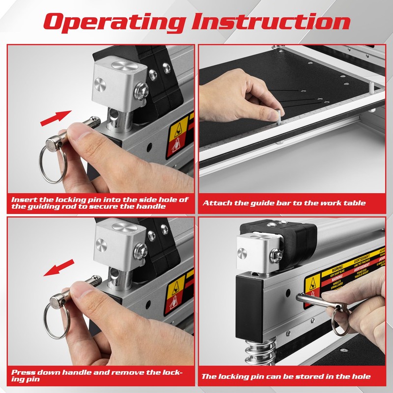 • Safe Operation Setting: Press down the handle can take the locking pin, when you are not using the floor cutter, insert the brake bar into the fixed handle, and make sure it's in an uncuttable state, that protects your safety (Blade has a protective cover); After putting into the wood floor, the angle and length can be aligned at the same time, and it is not necessary to align and cut again, save time and improve cutting efficiency