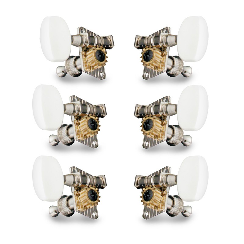 - Complete set of 6 open-gear tuners (3-left, 3 right), with press-fit bushings (6) and mounting screws (12)