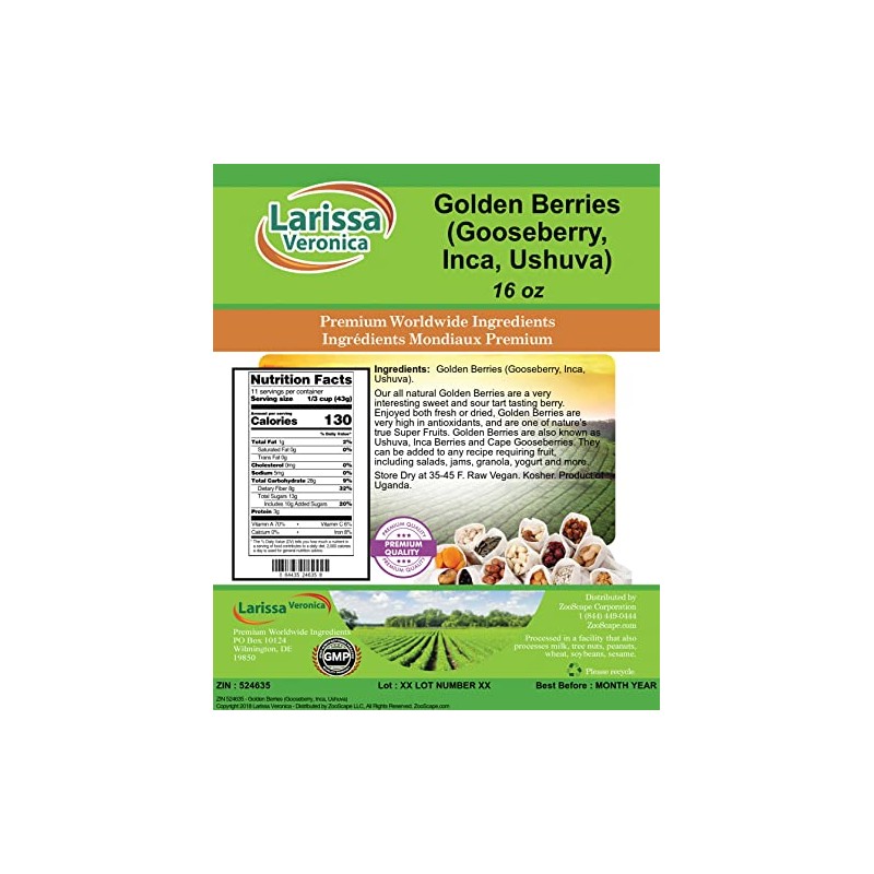 Our all natural Golden Berries are a very interesting sweet and sour tart tasting berry. Enjoyed both fresh or dried, Golden Berries are very high in antioxidants, and are one of nature's true Super Fruits. Golden Berries are also known as Ushuva, Inca Berries and Cape Gooseberries. They can be added to any recipe requiring fruit, including salads, jams, granola, yogurt and more. - Larissa Veronica is an exclusive line of natural premium-quality products that use only the purest and finest ingredients from around the world. Larissa Veronica is hallmarked by the highest possible standards of purity, stability and freshness. All of our products are prepared with the highest elements of quality control, from raw materials through the entire manufacturing process, up to and including the moment that the bottles or bags are sealed for freshness and shipped out to you. Our highest possible standards are certified by independent laboratories and backed by our personal guarantee. - Larissa Veronica strives to make all products affordable and we are constantly researching the market to maintain our affordability and to look for new ways to serve you and the ones you love. Larissa Veronica has become a trusted household name for many families. - Larissa Veronica is packed in tamper-proof, food-grade, recyclable containers. - ZooScape is proud to be the exclusive distributor of all Larissa Veronica spices, snacks, foods and ingredients in the United States, Canada and around the world. - Store Dry at 35-45 F. Raw Vegan. Kosher. Product of Uganda.