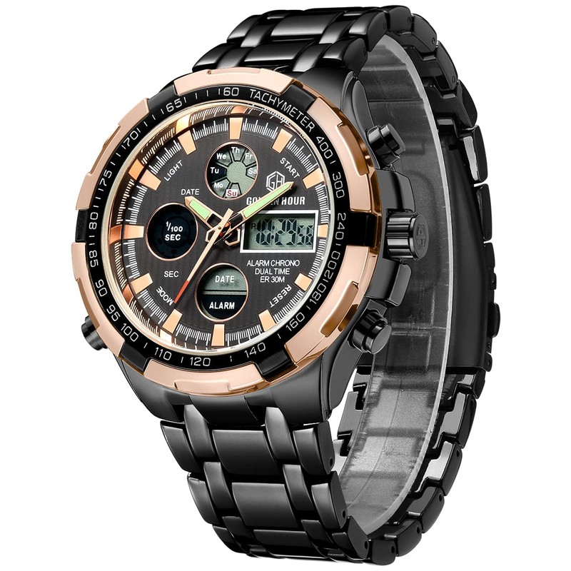GOLDEN HOUR Heavy Stainless Steel Analog Digital Mens Watches Work Sport Waterproof Big Face Wristwatch Rose Gold Black