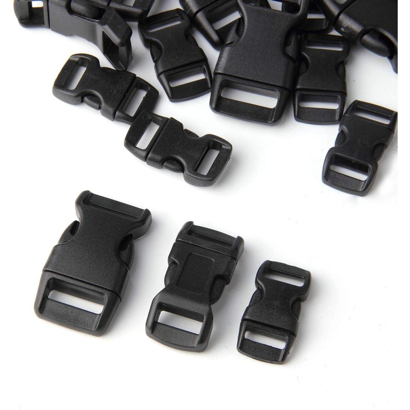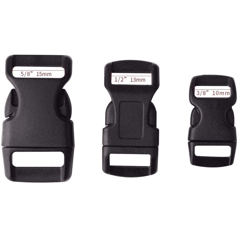 - Package include:20 each of the 5/8", 1/2", & 3/8" black side release buckles.