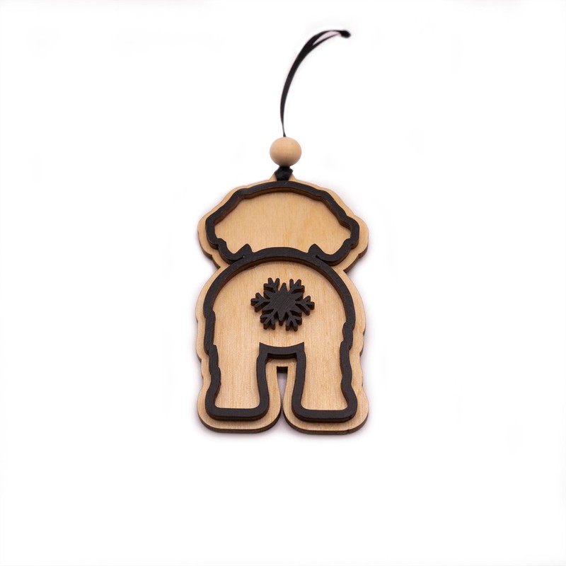 Ornament is laser cut from natural stained wood.The top outline layer and snowflake are painted black. A bead and ribbon adds the finishing touch. Comes with an organza bag.