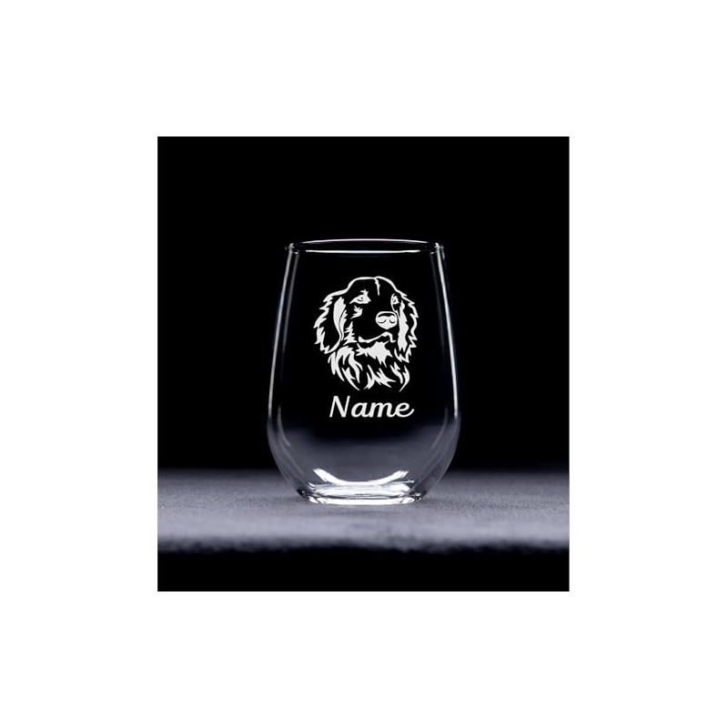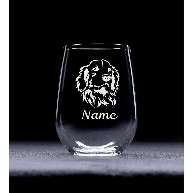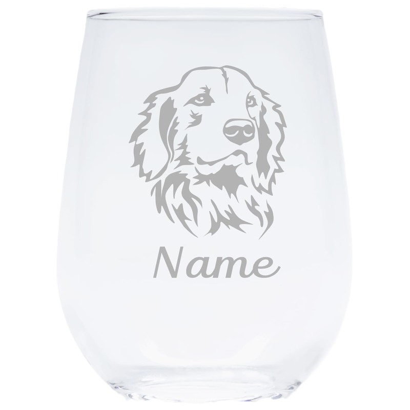 - Personalized Design: Elegant stemless wine glass with a Golden Retriever dog etched on the surface.