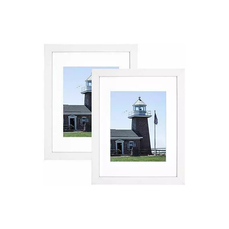 Designed and Manufactured by Lightweight, Simple and classic, perfect for framing pictures, photographs, and all sorts of artwork. The smooth molding is a timeless design that is shown to do its job with little to no fuss. Put up your photos and prints you've been meaning to, redecorate your living space, start persevering the memories in your life today. Package Includes: Two - 11x14 White Wood Frames Frame Details: Frame Overall size: 15.6 x 12.6 x 0.75 inches Frame display opening: 10.6 x 13.6 inches Fit 8x10 (with mat) or 11x14 (without mat) Artwork Print, Photo Molding: 1-inch wide (10 mm approximate), Color: White Includes Frontal Acrylic Sheet Backboard with 2 attached Sawtooth Foldable Hinged hangers for wall hanging Back has Turning hardware clips to secure the frame Landscape or Portrait Orientation Material: Wood Mat Details: Color: White Mat Opening/Inner size: 7.5 x 9.5 inches (Made to fit for 8x10 prints or photo) White Core Bevel cut, 4-ply thick (about 1.4 mm or 1/16 inch)