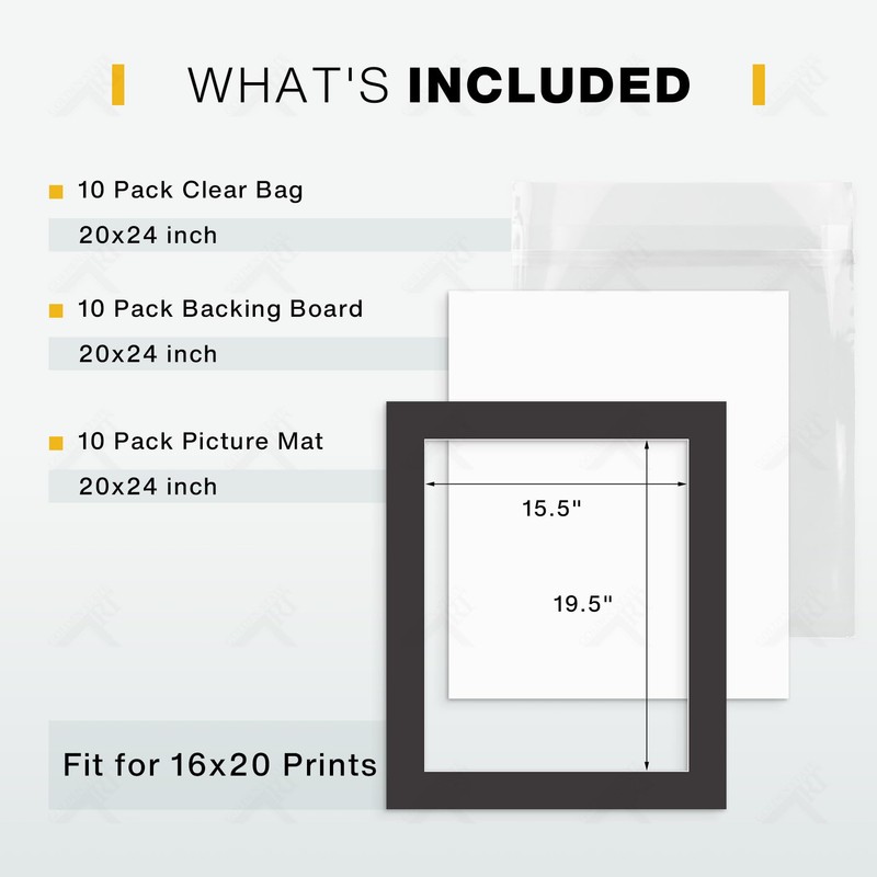 Golden State Art, Pack of 10, Pre-Cut 20x24 Black Picture Mat Kit for 16x20 Photo, 10 White Core Bevel Cut Mattes, 10 Backing Boards and 10 Clear Bags
