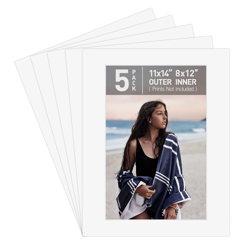 Golden State Art, Pack of 5 Acid Free Bevel Cut 4-Ply Thickness White Core Picture Mats for Photos (White, 11x14 for 8x12 Photo)