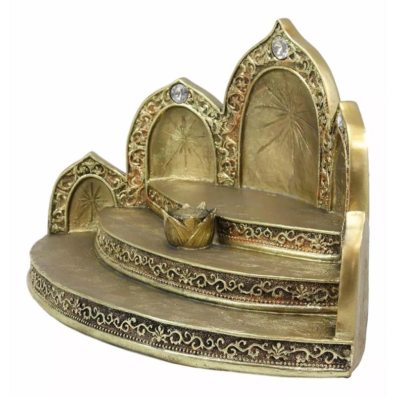 • This Golden Tibetan Buddhism Altar Shrine Display with Lotus Padma Incense Holder is perfect for displaying our Buddha Miniatures sold separately in our store (3" size category). Painted in gold, the altar display stand is adorned with crystals and lace designs throughout the borders. Light your incense sticks on the padma lotus holder in the center of the display stand as you use this display stand as a Feng Shui or Zen accent decor.