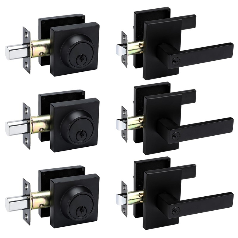 goldenwarm 3 Pack Black Door Handle with Deadbolt, Square Contemporary Matte Black Exterior Door Lock Set with Deadbolt, Heavy Duty Zinc-alloyed Front Entry Door Locksets with Deadbolt