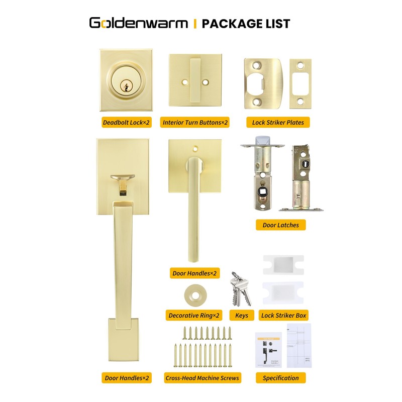 goldenwarm Double Front Door Lock Set, Gold Double Front Door Handle with Dummy, Square Exterior Door Lever with Reversible Lever, Single Cylinder Deadbolt Combo