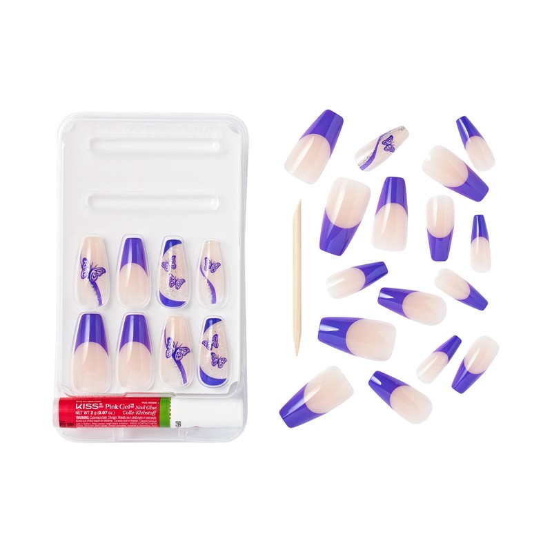 GoldFinger 24 Pcs Press On Nails, Long Coffin Fake Nails, Purple Butterfly Gel Stick On Extensions, Reusable Full Cover False Nail Kit with Glue, Manicure Stick & File, 7 Day Long Lasting Wear