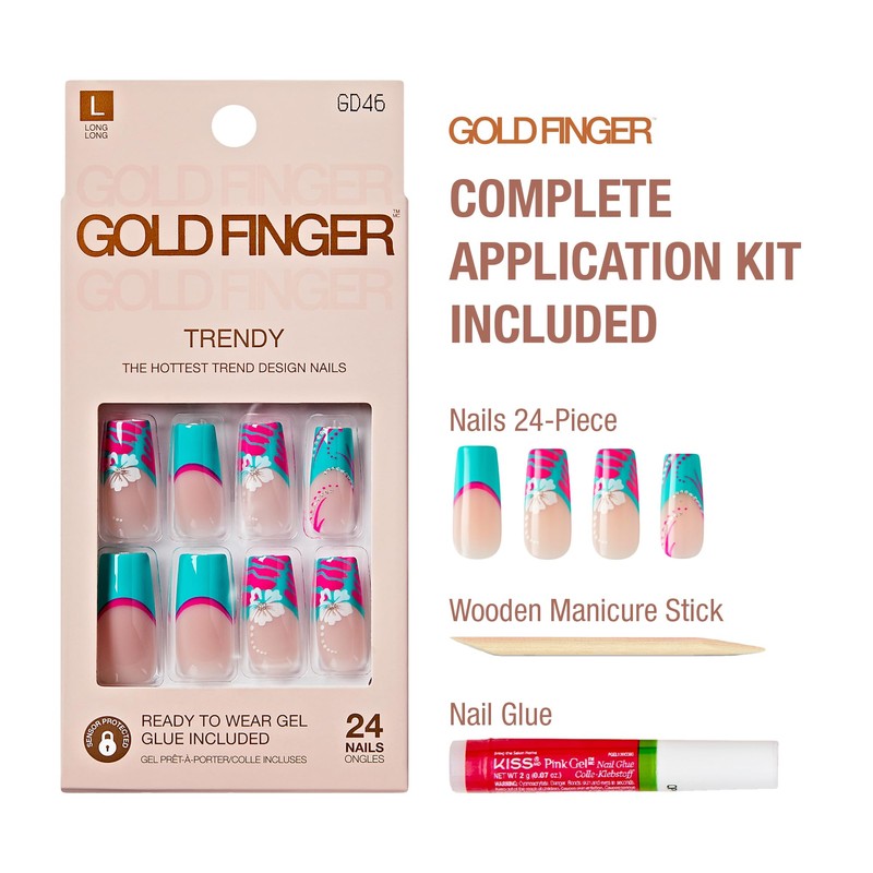 Upgrade your manicure with GoldFinger Press On Nails, a versatile, high-quality nail kit featuring a variety of trendy nail shapes and designs. Whether you love coffin, almond, square, or oval styles, this set offers a salon-quality manicure in minutes without the hassle or expense of a nail appointment. Each kit includes 24 reusable full cover nails in assorted sizes, along with nail glue, a mini file, and a cuticle stick, ensuring a customizable and flawless application. Designed for 7-day wear, these nails provide a secure fit that stays put, while the superior gel finish offers a chip-resistant durability. For those who love eco-conscious beauty, these reusable nails come in boxes printed with soy ink, making them a safer and more sustainable alternative to traditional press-ons boxes Whether you're into minimalist French tips, bold abstract designs, dazzling glitter accents, or modern chrome finishes, GoldFinger Press On Nails are perfect for daily wear, nights out, or special occasions.