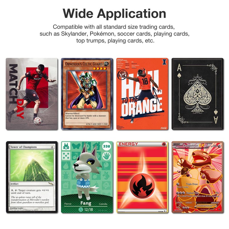 • Card collection: for standard format trading cards, such as Magic: The Gathering, compatible with Pokemon, Lego Ninjago, Force of Will, Match Attax, World of Warcraft, as well as Japanese sizes such as Yu-Gi-Oh, YGO, but also useful for storing or as an organiser of business cards or other trading card games, cards from board games and sticker collections.
