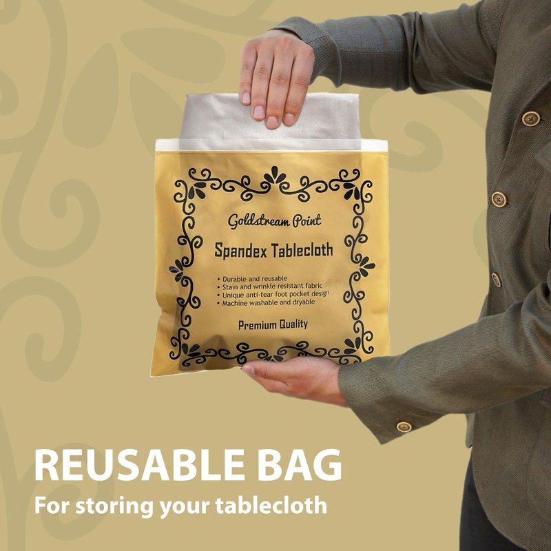 - Innovative Durability - Our tablecloth features a unique anti-tear foot pocket design engineered for longevity, ensuring that your tablecloth remains flawless after each use. A custom-designed reusable storage bag is included with each tablecloth.