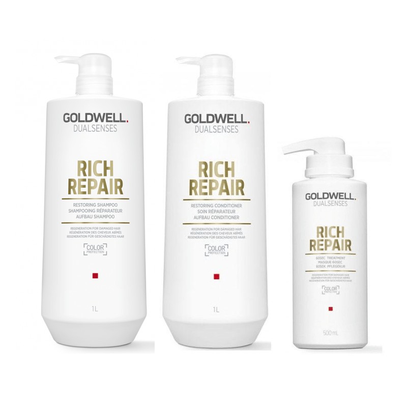 Goldwell Dualsenses Rich Repair Big Bottle Trio Bundle includes Goldwell Dualsenses Rich Repair Restoring Shampoo 1000ml, Goldwell Dualsenses Rich Repair Restoring Conditioner 1000ml, and Goldwell Dualsenses Rich Repair 60 Second Treatment 500ml.