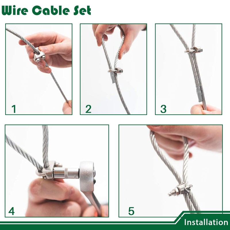 - Stable and Wind Resistant: Shade sail hardware kit includes 1FT stainless steel wire rope and 8 clamps. 3/16" diameter. Suitable for windy areas or large fixed devices such as sunshades, pergolas, and awnings.