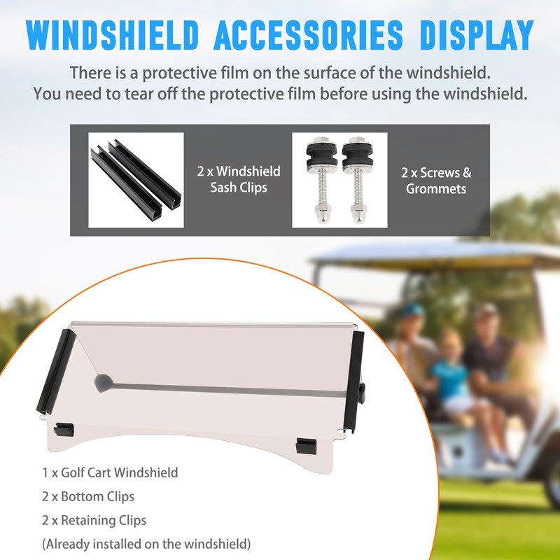 - Note: The golf cart windshield comes with a protective film designed to safeguard the glass surface from scratches and damage during transportation. Before using the windshield, please make sure to completely tear off this protective film to ensure that the transparency and functionality of the windshield are not compromised.