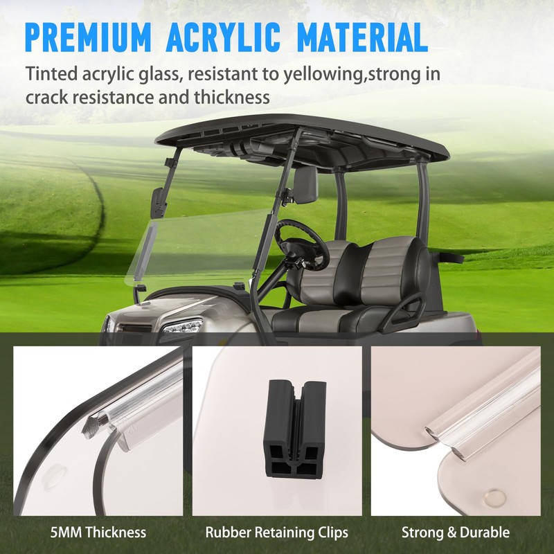 - Material Advantages: This golf cart windshield is made from premium acrylic material, which does not yellow over time, ensuring its strength and durability. It also features UV resistance, shatter-proof, impact-resistant, and crack-resistant properties, providing you with comprehensive protection suitable for year-round use.