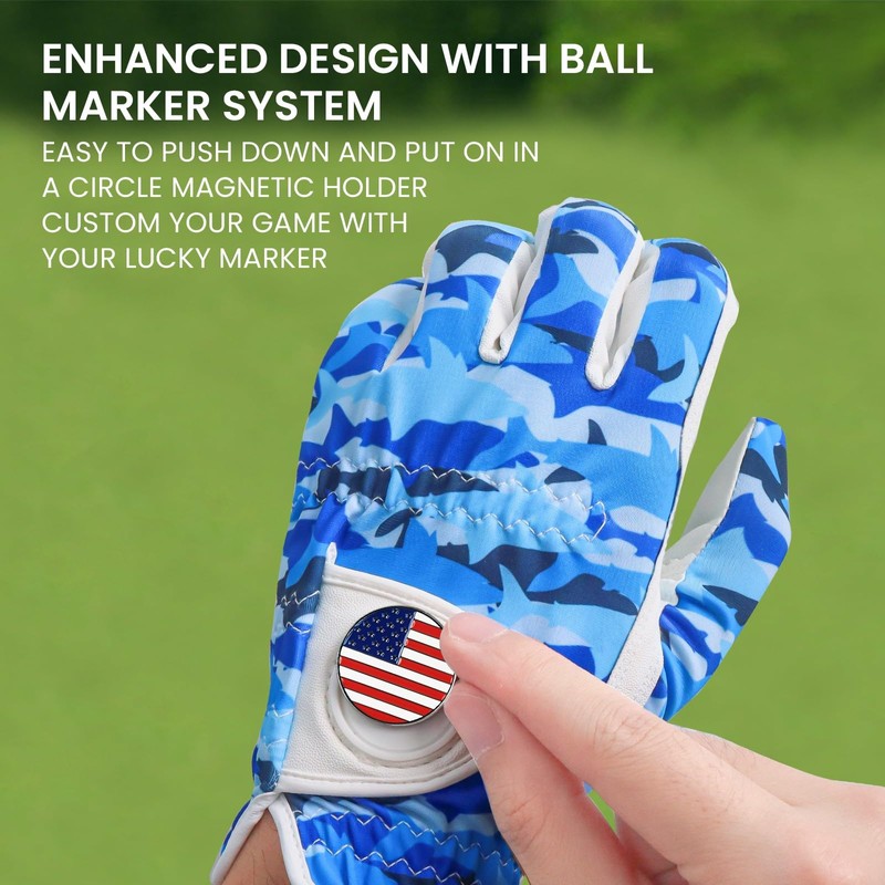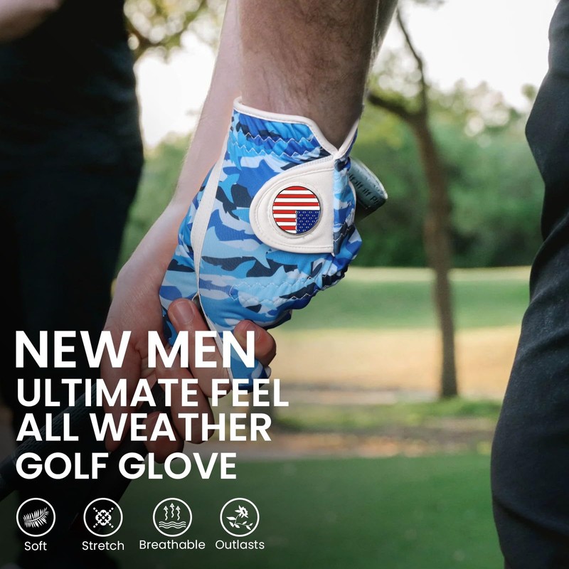 Golf Gloves Men Right Handed Golfer Left Hand with Ball Marker 2 Pack Leather Breathable Comfortable Weathersof Grip Size Small Medium ML Large XL (Blue&Camouflage, Large(Worn on Left Hand))