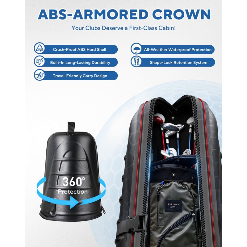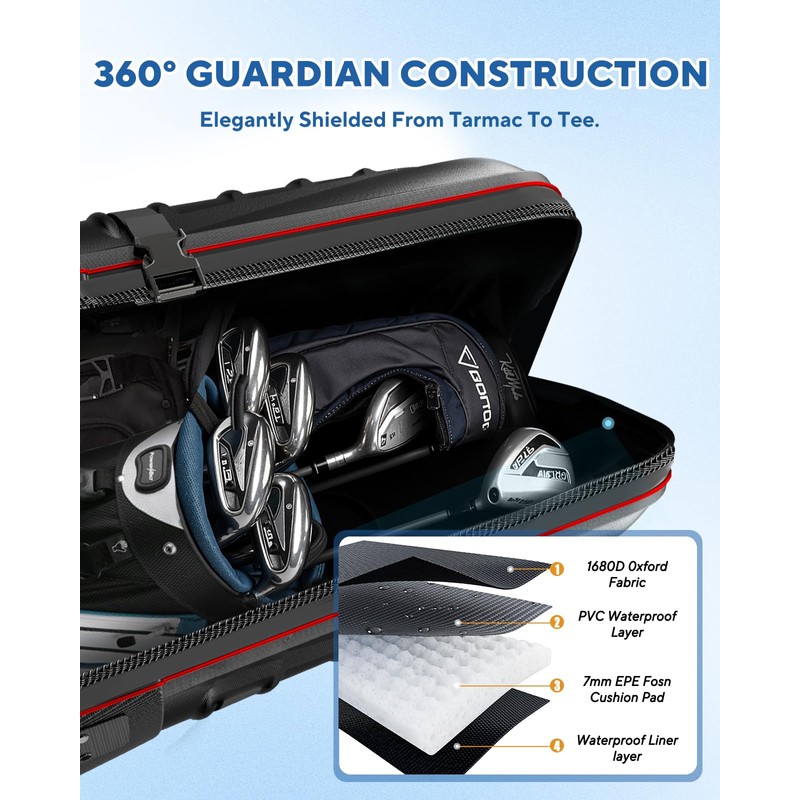 - 【Maximum Golf Club Protection】The golf travel bags features a crush-resistant ABS top for protection of your golf clubs. With exceptional durability and superior waterproofing, The 1680D water-resistant nylon protects your equipment from rain and moisture on every journey.The internal security strap of this golf club protector for travel bag also keeps your clubs stable and organised.