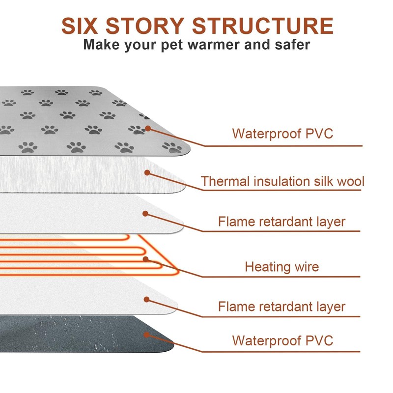 - 【Safety Protection】The pet heating pad is composed of 8 layers of protective structure, the wire is covered with a metal shell, and the reinforced buckle at the cable connection can prevent it from being damaged by pets, so you don't need to worry about electric shock, and your pet can use it with confidence.