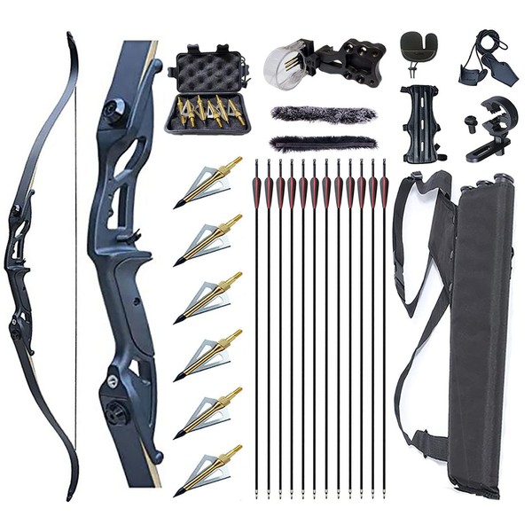 • PACKAGE: 1 x Recurve bow, 1 x Arrow rest, 1 x Bowstringer tool, 1 x Arm guard, 1 x Archery finger guard, 1 x 3 Pin bow sight, 1 x 3 Tube arrow quiver, 6 x Arrowhead (with box), 12 x Mixed carbon arrows.